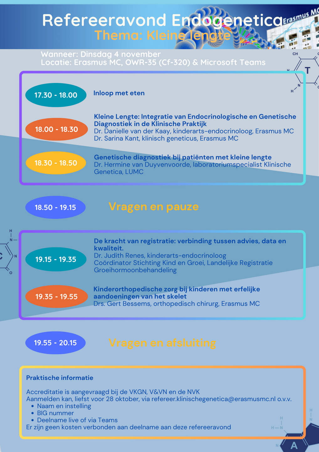 Aanmelden kan door een e-mail te sturen naar refereer.klinischegenetica@erasmusmc.nl bij voorkeur voor 28 oktober met de volgende gegevens: naam, instelling en afdeling, BIG nummer, deelname live of via teams.
